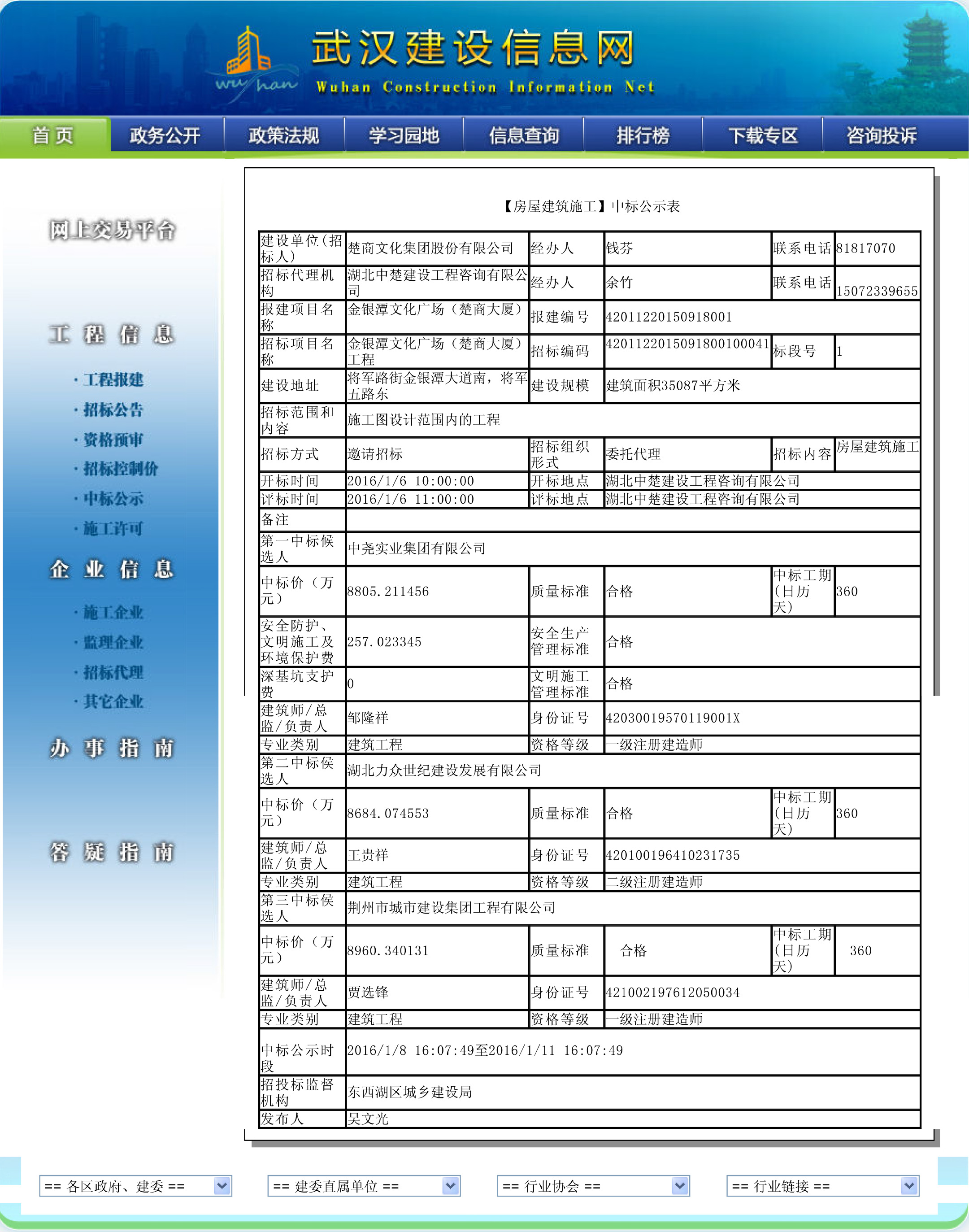 金銀潭文化廣場(chǎng)(楚商大廈)工程中標(biāo)公示